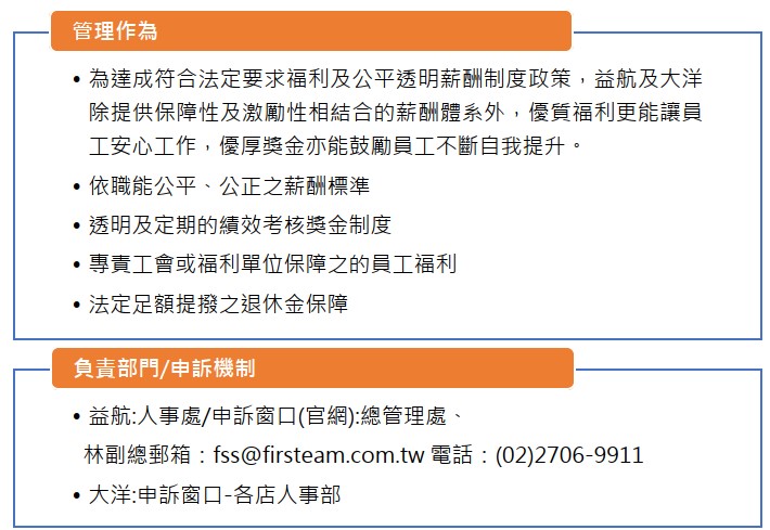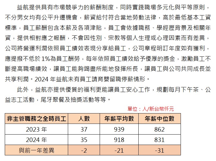 為達成符合法定要求福利及公平透明薪酬制度政策,益航除提供保障性及激勵性相結合的薪酬體系外,優質福利更能讓員工安心工作,優厚獎金亦能鼓勵員工不斷自我提升。